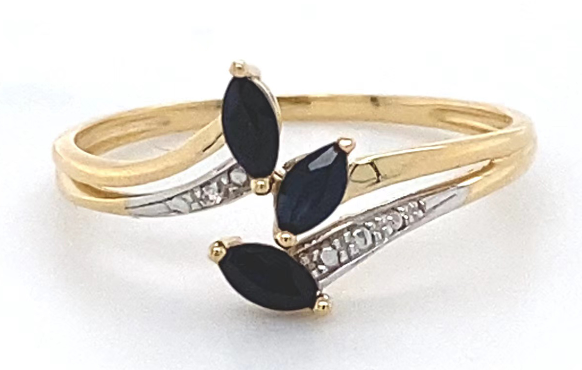 Three claw set marquise natural blue sapphires, colour is “medium dark, moderately strong, blue”.